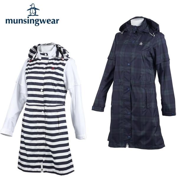 マンシングウェア ツイルプリントレインウェアは、ホワイトにブラックボーダーのマリンテイストの柄とネイビーにブラックウォッチ柄の2展開。女性らしいシルエットと落ち着いた印象の色使い、デザインが上品なレインウェアです。半袖に替えられるほか、専用の収納袋がついています。嵐にも耐えられる高い耐水圧を誇り、高透湿性なストレッチ素材を使用しています。特に、ジッパー開閉部分を上からスナップボタン式のベロで覆ったデザインのため、雨が降ったりやんだりとはっきりしない天気の時に、ジッパーを閉じずにスナップだけ留める着こなしが選べます。スナップボタンなら脱ぎ着も簡単なので、雨がやんだらさっと脱いで、また雨が降り出した時にはぱっと羽織るなど、天候のはっきりしない時にあると便利なゴルフレインウェアと言えるでしょう。